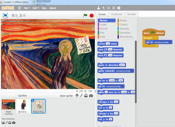 이렇게 스크래치 프로그램에 아이들 그림을 넣어주고요